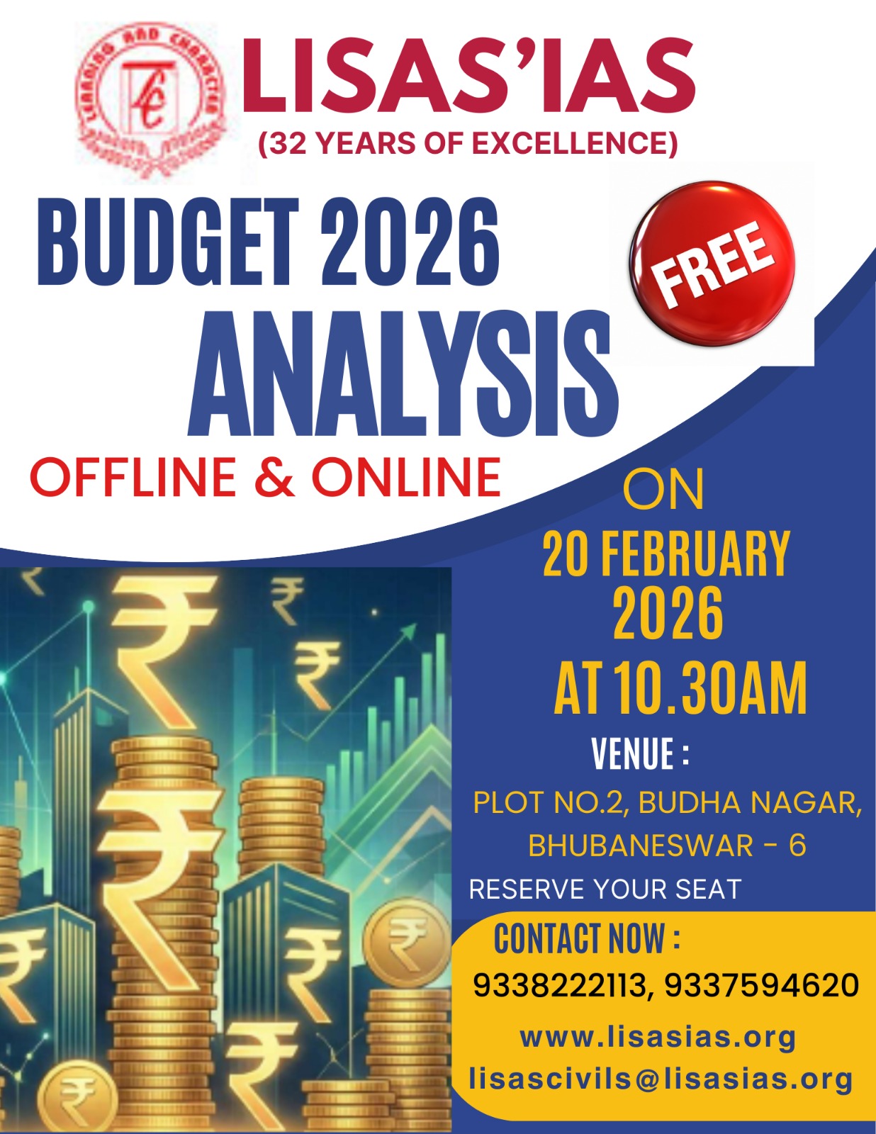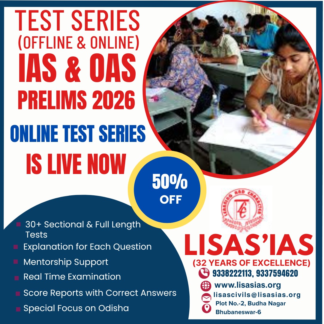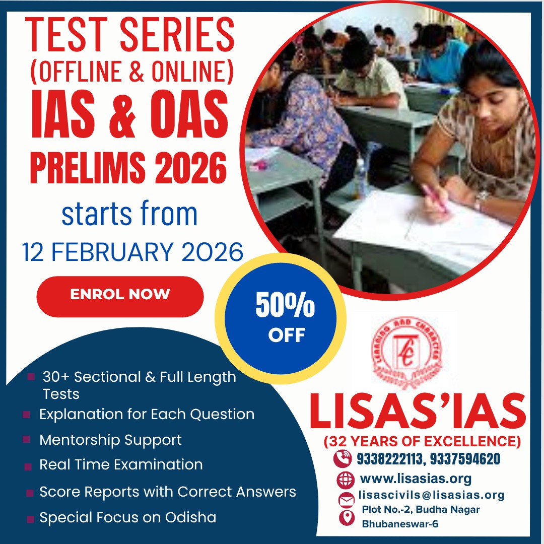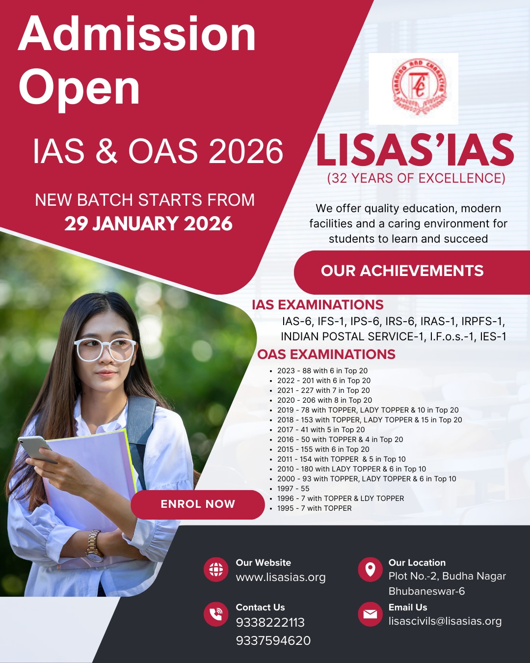 LISAS'IAS, the premier institute of Odisha, imparting guidance exclusively for UPSC/OPSC Civil Services Examinations since 1993 has already set a tradition of success. Its results always remain unmatched. As oldest and best in Odisha, it is the most popular institute among the students preparing for Civil Services Examinations. Read More...